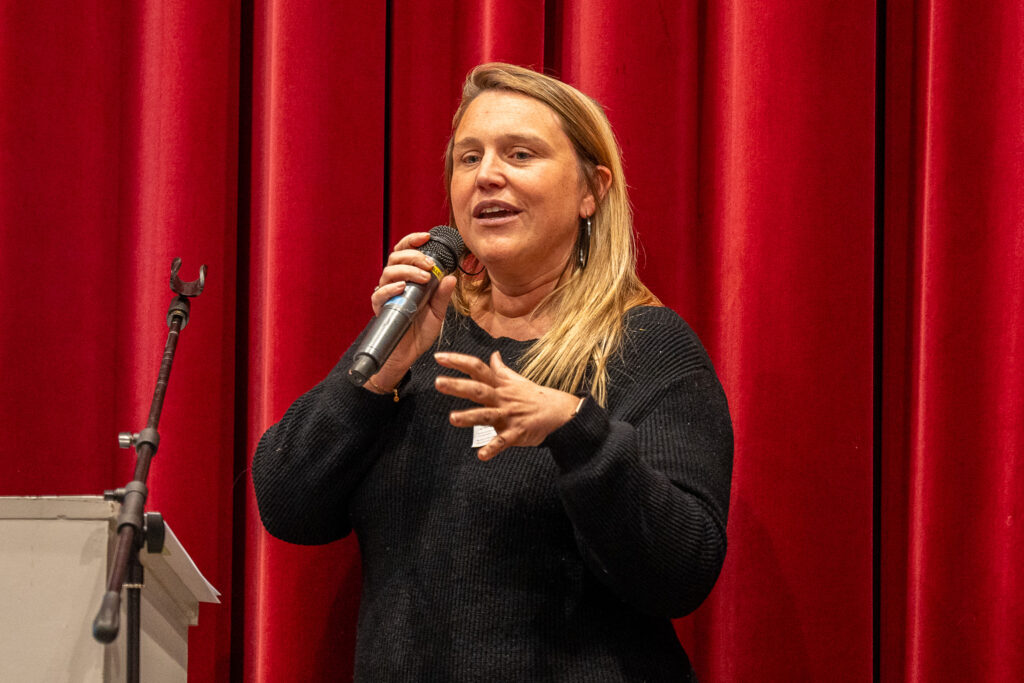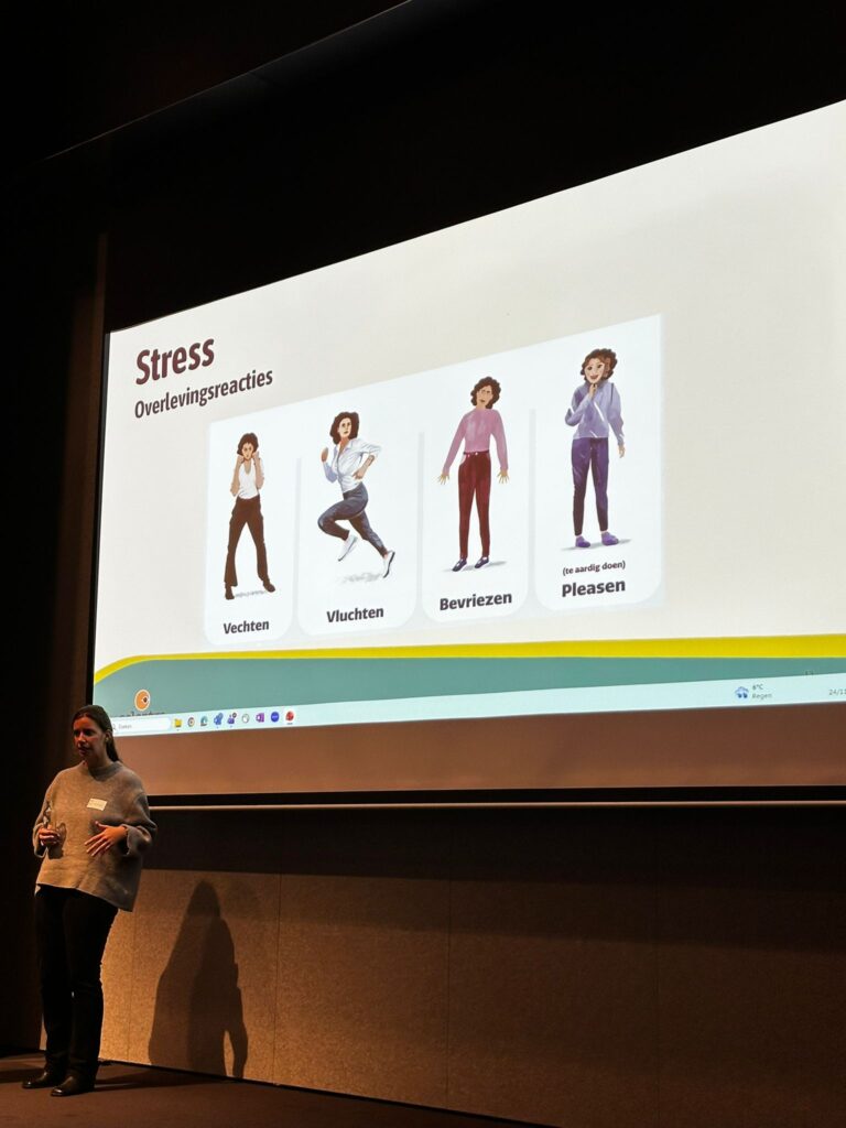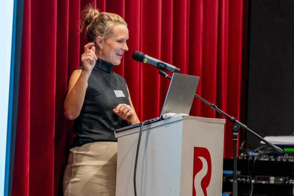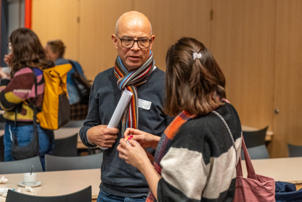 Na de verwelkoming was het de beurt aan Fatima en Charlotte. Fatima, die 14 maanden geleden naar België kwam, deelde haar ervaringen als inburgeraar. In haar land van herkomst behaalde Fatima een diploma in ‘business administration’. Door een taalstage bij Thomas More in Turnhout kreeg Fatima niet alleen de taal sneller onder de knie, maar verruimde ze ook haar netwerk. Ze vertelde enthousiast over de uitdagingen van het Belgische dialect, waarbij woorden soms onherkenbaar klinken. Zo werd ‘praten’ soms ‘klappen’ aan het onthaal. Charlotte, haar stagementor, reflecteerde op hoe waardevol de taalstage was voor de organisatie. Het bracht niet alleen interculturele inzichten, maar versterkte de werking mede dankzij Fatima’s enthousiasme.